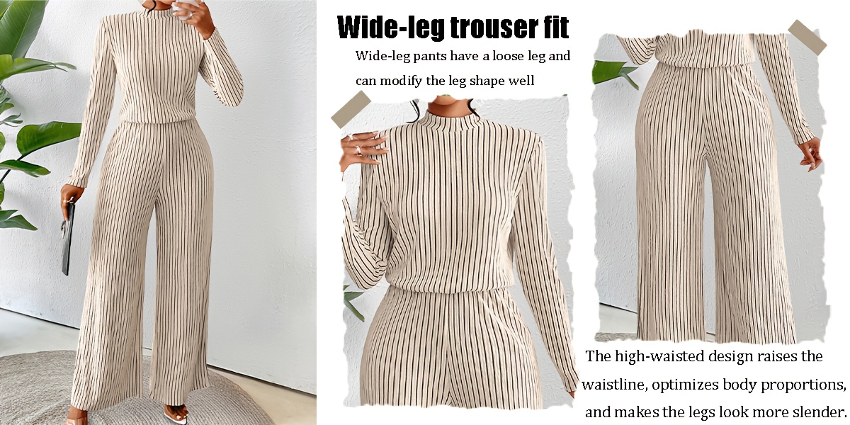 Women's Elegant High Neck Long Sleeve Wide Leg Jumpsuit - Soft Striped Jumpsuit, Machine Washable, Suitable for Fall Wear, Women's Jumpsuit, Fall Clothes, Sophisticated Style, High Quality Workmanship