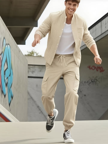 طقم كتان رجالي أنيق وعصري، مثالي لمختلف المناسبات. مصنوع من 95% كتان عالي الجودة، يتميز بتصميم بسيط بلون سادة مع ياقة قميص وأكمام طويلة، وبنطلون طويل مريح. خفيف الوزن ومناسب لجميع فصول السنة، يمنحك إطلالة راقية وعملية. سهل العناية به بالغسيل اليدوي.
