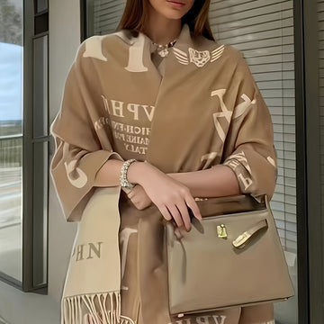 1pc Elegant Beige "VPH" Print Scarf, 200cm - Double-Sided, Fringed, Warm Winter Scarf for Women, Stylish Office & Casual Attire, Polyester, Hand Washable, Office Accessory | Stylish Winter Scarf | Fringed Scarf Detail, Winter Scarf