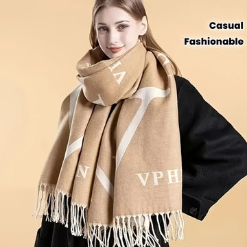 Elegant Beige Scarf with "VPH" Letter Design - Soft, Warm, Double-Sided Polyester Wrap for Women, Perfect for Casual Outings, Casual Accessory | Stylish Lettering | Jacquard Weave