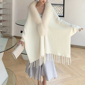 Women's Faux Mink Fur Cape-Style Shawl - Mid-Length Warm Windproof Open Front with Fringe Detailing, Elastic Fit for Versatile Outerwear, Solid Color Fashionable Cold Weather Accessory, Winter Shawl, Soft Texture